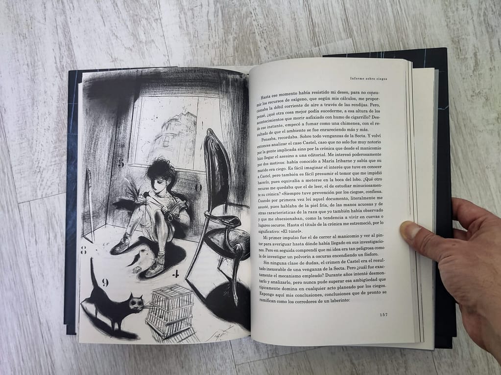 «Informe sobre ciegos» es una obra de su tiempo; quizás, incluso, de un poco antes porque bebe de los grandes clásicos en primera persona de finales del siglo XIX y principios del XX como Poe, Conan Doyle o Lovecraft… Pero, sí, es de su tiempo, y está llena de intrigas, espionaje, conflictos internacionales y secretos; todo muy de los años sesenta. Detrás de eso que la completa, «Informe sobre ciegos» es una mirada a la mente de un loco, un viaje en busca del sentido de la vida, así como una huida infructuosa de la propia fatalidad del protagonista, Fernando Vidal Olmos, que bien es señalada al inicio de la novela: «¿Cuándo empezó esto que ahora va a terminar con mi asesinato?» Vidal Olmos piensa que los ciegos son una secta criminal que domina la vida (¿de dónde sacaste este argumento Sábato?), y los persigue por el submundo de Buenos Aires, mientras escribe sus averiguaciones en este informe para que sea leído cuando él ya no esté. Sus capítulos, cortos y llenos de fantasía, y las ilustraciones de Luis Scafati agilizan una lectura que me ha gustado, pese a rebosar varios comentarios contra las mujeres que no han envejecido nada bien.