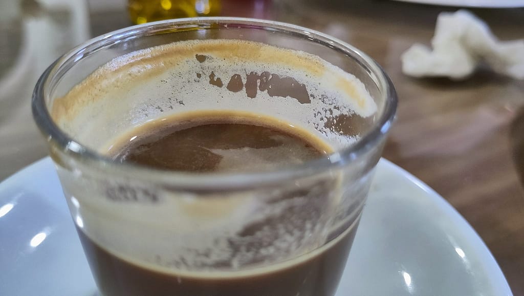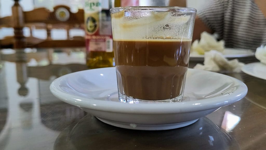 El cortado, así lo recuerdo en manos de mi madre, es en taza, pero aquí no, aquí lo sirven en este vasito de Duralex tan cuqui ¡cómo son! Y arde, claro, y entona y acompaña, y es el inicio de un nuevo día que empieza y gusta, y que me hace darle las gracias a la vida.